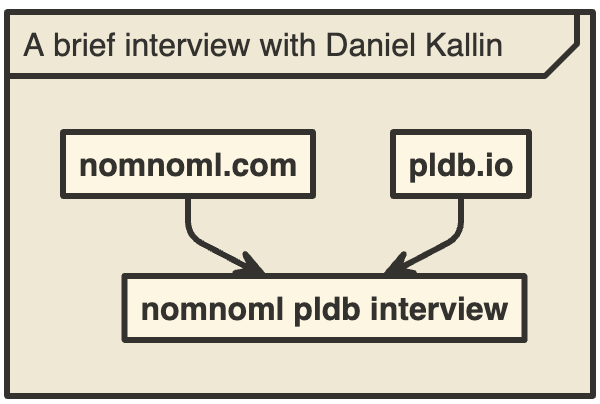 Continue reading...July 25, 2024 — Daniel Kallin's brilliant homepage shows technical chops and design passion. Therefore it's not surprising that Daniel created nomnoml: a fast language and tool for generating beautiful diagrams. Daniel sat down with us to talk about nomnoml, which he designed for users to "feel like you're drawing with Ascii". Thank you for your time Daniel!